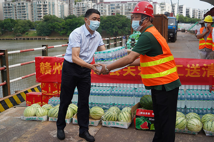 在慰問現(xiàn)場,賴定銘一行為南河大橋拓寬改造(二期)工程項目高溫下堅守崗位的一線職工發(fā)放了西瓜、礦泉水、王老吉等防暑降溫物品,并與項目一線職工交流談心,詢問了職工積極推進項目建設(shè)進展情況,聽取了贛州城投集團高溫津貼發(fā)放情況和落實高溫天氣作業(yè)勞動保護的有關(guān)措施,叮囑大家要科學(xué)安排高溫期間的施工任務(wù),要堅持勞逸結(jié)合,特別要注意身心健康和施工安全,要認真做好項目工地疫情防控工作。