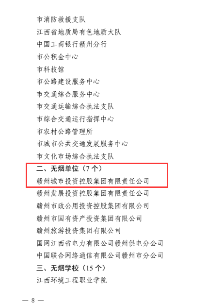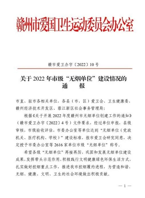 5月31日,在贛州市第35個(gè)世界無(wú)煙日“煙草危害環(huán)境”主題宣傳活動(dòng)會(huì)議上,贛州市愛(ài)國(guó)衛(wèi)生運(yùn)動(dòng)委員會(huì)公布了2022年市級(jí)“無(wú)煙單位” 、“無(wú)煙家庭”名單。贛州城投集團(tuán)榮獲“市級(jí)無(wú)煙單位”榮譽(yù)稱號(hào),五名員工家庭喜獲“無(wú)煙家庭”榮譽(yù)稱號(hào)。