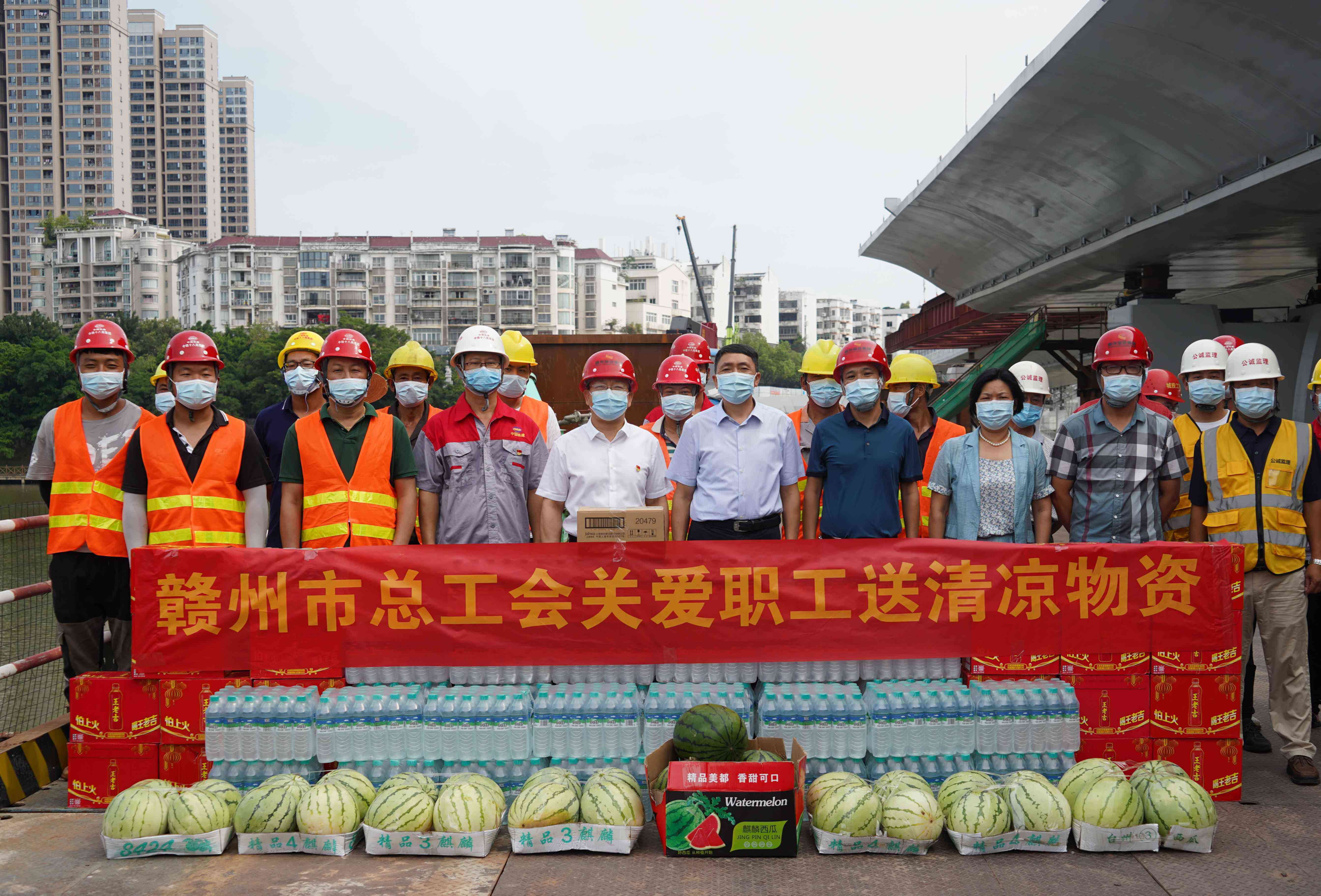 在慰問(wèn)現(xiàn)場(chǎng),賴定銘一行為南河大橋拓寬改造(二期)工程項(xiàng)目高溫下堅(jiān)守崗位的一線職工發(fā)放了西瓜、礦泉水、王老吉等防暑降溫物品,并與項(xiàng)目一線職工交流談心,詢問(wèn)了職工積極推進(jìn)項(xiàng)目建設(shè)進(jìn)展情況,聽(tīng)取了贛州城投集團(tuán)高溫津貼發(fā)放情況和落實(shí)高溫天氣作業(yè)勞動(dòng)保護(hù)的有關(guān)措施,叮囑大家要科學(xué)安排高溫期間的施工任務(wù),要堅(jiān)持勞逸結(jié)合,特別要注意身心健康和施工安全,要認(rèn)真做好項(xiàng)目工地疫情防控工作。
