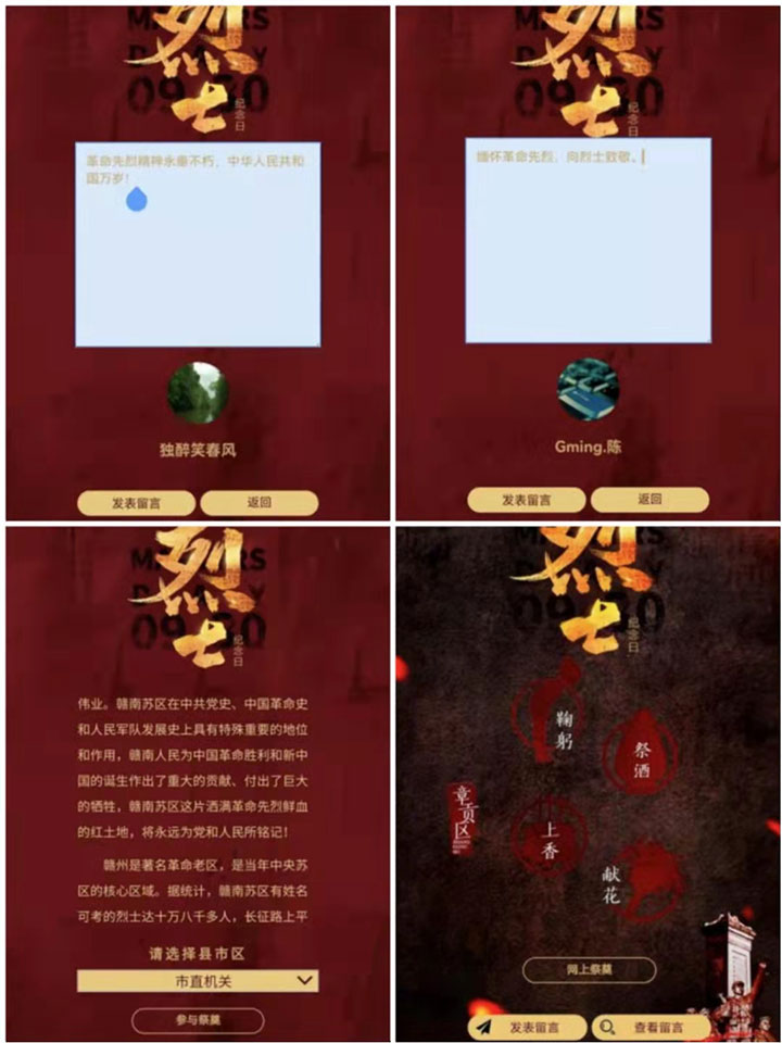 在第八個(gè)“烈士紀(jì)念日”之際,贛南日?qǐng)?bào)推出了網(wǎng)上祭奠活動(dòng)。集團(tuán)積極響應(yīng),認(rèn)真組織集團(tuán)18個(gè)黨支部(黨總支)250余名黨員在辦公室、項(xiàng)目工地、公園廣場、高鐵西站等地現(xiàn)場用手機(jī)或電腦,進(jìn)入贛南日?qǐng)?bào)推出的網(wǎng)絡(luò)祭奠平臺(tái),為身邊贛南籍的革命英雄烈士在線鞠躬、祭酒、獻(xiàn)花、上香、留言等形式網(wǎng)上祭奠250余人次,深切緬懷革命先烈,引導(dǎo)黨員感恩前進(jìn),牢記使命,大力傳承好紅色基因。