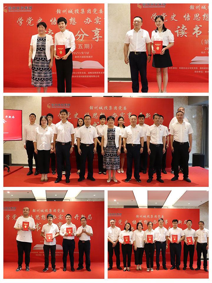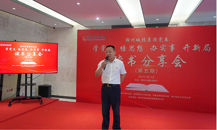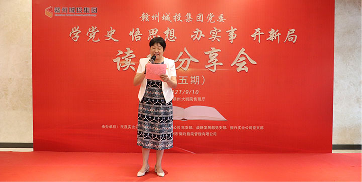 9月10日,為推動(dòng)黨史學(xué)習(xí)教育有特色、出成效,贛州城投集團(tuán)黨委在贛州大劇院售票廳舉辦“學(xué)黨史 悟思想 辦實(shí)事 開新局”黨史學(xué)習(xí)教育第五期讀書分享會(huì)。市國資委二級(jí)調(diào)研員宋英蒞臨指導(dǎo),集團(tuán)黨委副書記黃家偉出席并作點(diǎn)評(píng)講話,集團(tuán)董事會(huì)秘書、集團(tuán)相關(guān)部門負(fù)責(zé)人、各黨支部書記及部分黨員參加。