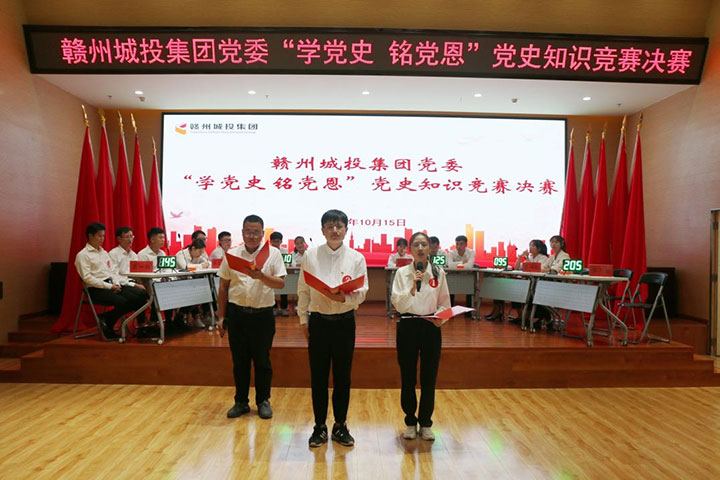 10月15日,贛州城投集團(tuán)黨委舉辦"學(xué)黨史 銘黨恩"黨史學(xué)習(xí)教育知識(shí)競(jìng)賽決賽。市國資委黨委黨史學(xué)習(xí)教育領(lǐng)導(dǎo)小組副組長、黨委委員、副主任黃曉東,市委組織部組織三科科長賴雯龍,市委黨史研究室正科級(jí)干部陳曄明,市委黨史研究室宣教科臨時(shí)負(fù)責(zé)人許偉卿應(yīng)邀到場(chǎng)指導(dǎo)。集團(tuán)黨委書記、董事長提名人選劉曉方,集團(tuán)黨委副書記、總經(jīng)理提名人選郭閩軍及其他黨員高管出席活動(dòng)。來自集團(tuán)各黨支部(黨總支)的6支代表隊(duì)的參賽選手及黨員、群眾代表等共約90人參加。